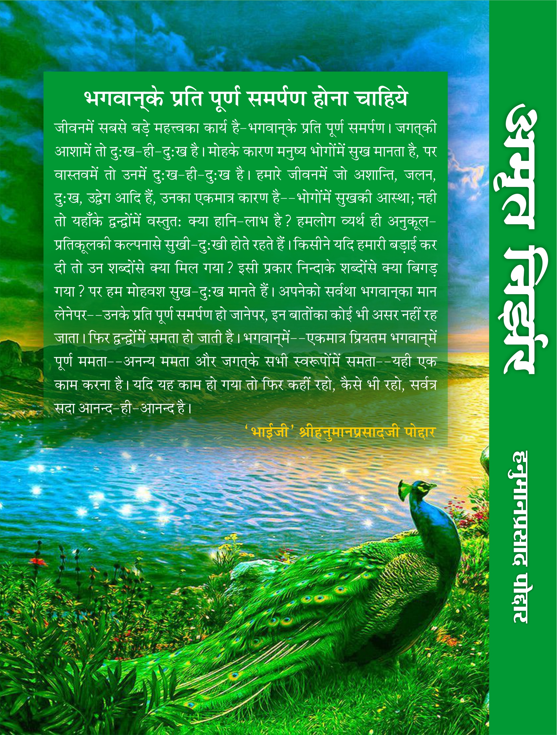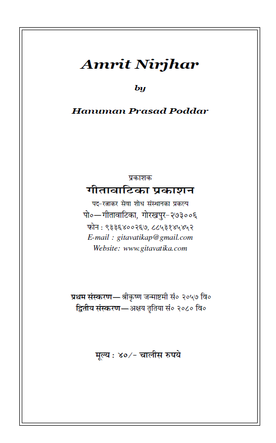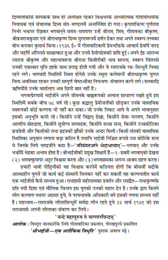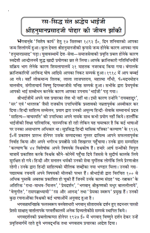 This is a collection of the sentences spoken from time to time in satsang by the saint ‘Bhaiji’ ‘Bhaiji’ Shri Hanuman Prasadji Poddar, who has attained the state of Supreme Bhagwati and has solved the problems of the pilgrims on the path of salvation. In the end, there is a brief description of Shri Bhaiji’s life-story.