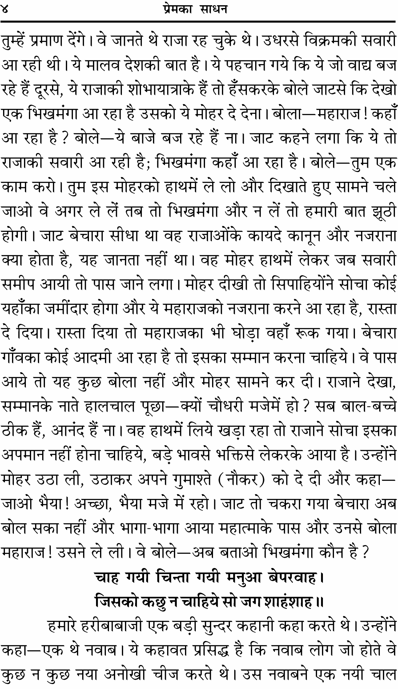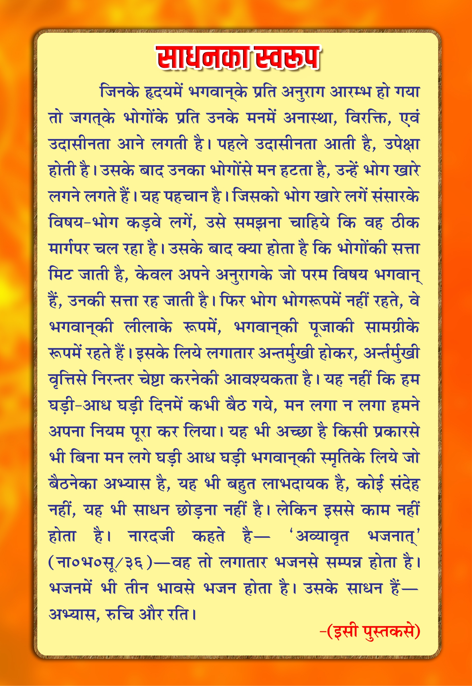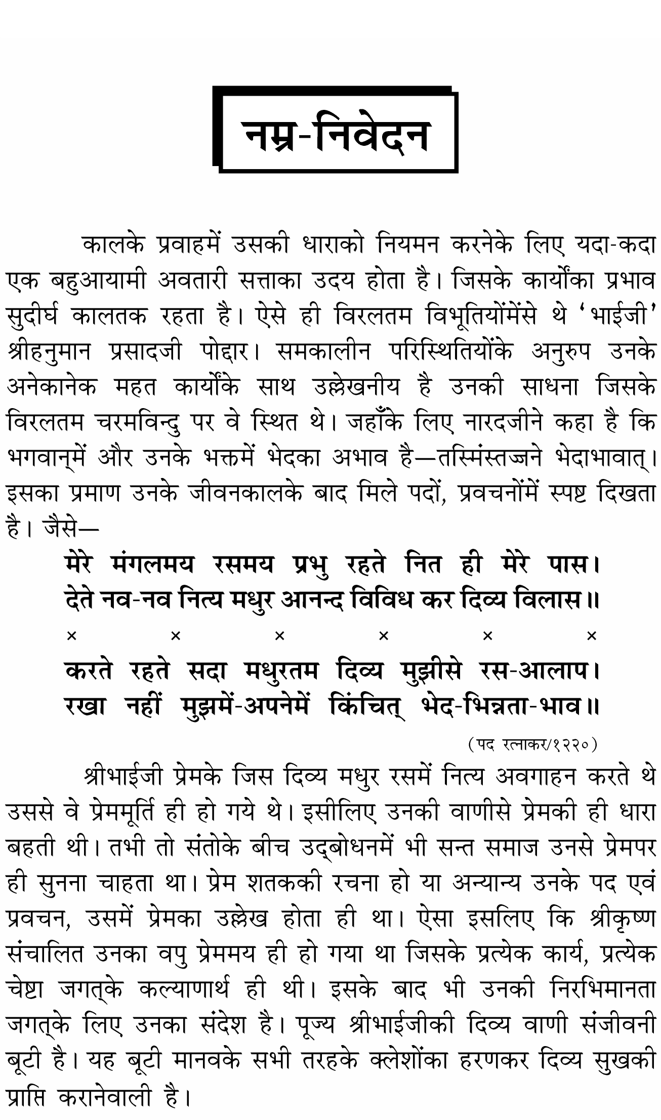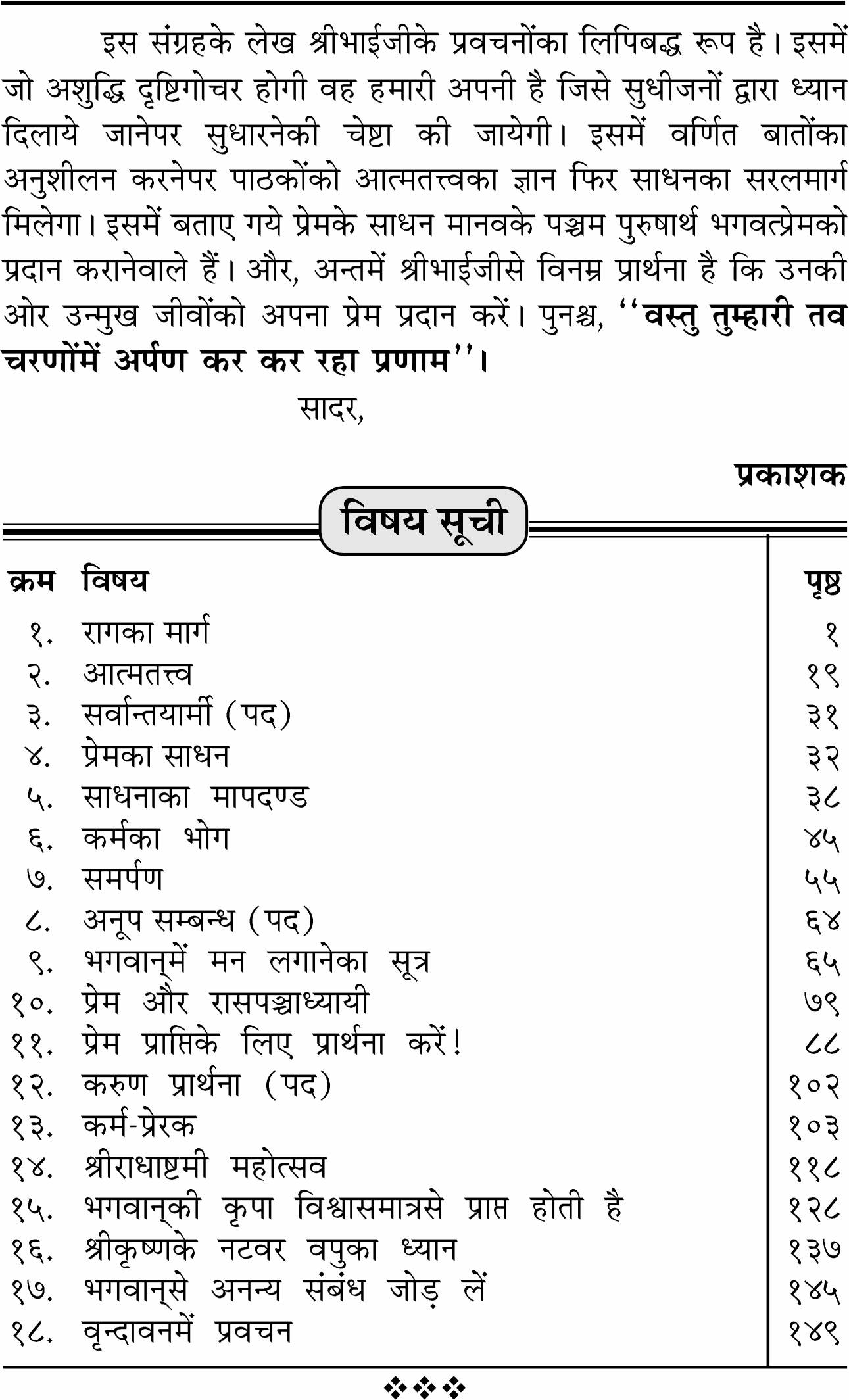 इसमें प्रेममूर्ति ‘भाईजी’ श्रीहनुमानप्रसादजी पोद्दार द्वारा आत्मतत्त्व, कर्मोंका प्रेरक कौन है ?, कर्मोंका भोग और रागका मार्ग तथा भगवान्में मन लगानेके सूत्रके साथ साधनाके मापदण्ड पर सुन्दर प्रकाश डाला गया है। प्रेमके साधन और प्रेम-प्राप्तिके लिए कैसे प्रार्थना करें आदि विषयोंपर सरल बोधगम्य भाषामें वर्णन है। साथ ही भगवान् श्रीकृष्णके नटवर वपुका मनोहर शब्द – चित्र किया गया है। एक सर्वोपयोगी संग्रहणीय एवं उपहार देने योग्य सुन्दर पुस्तक है।