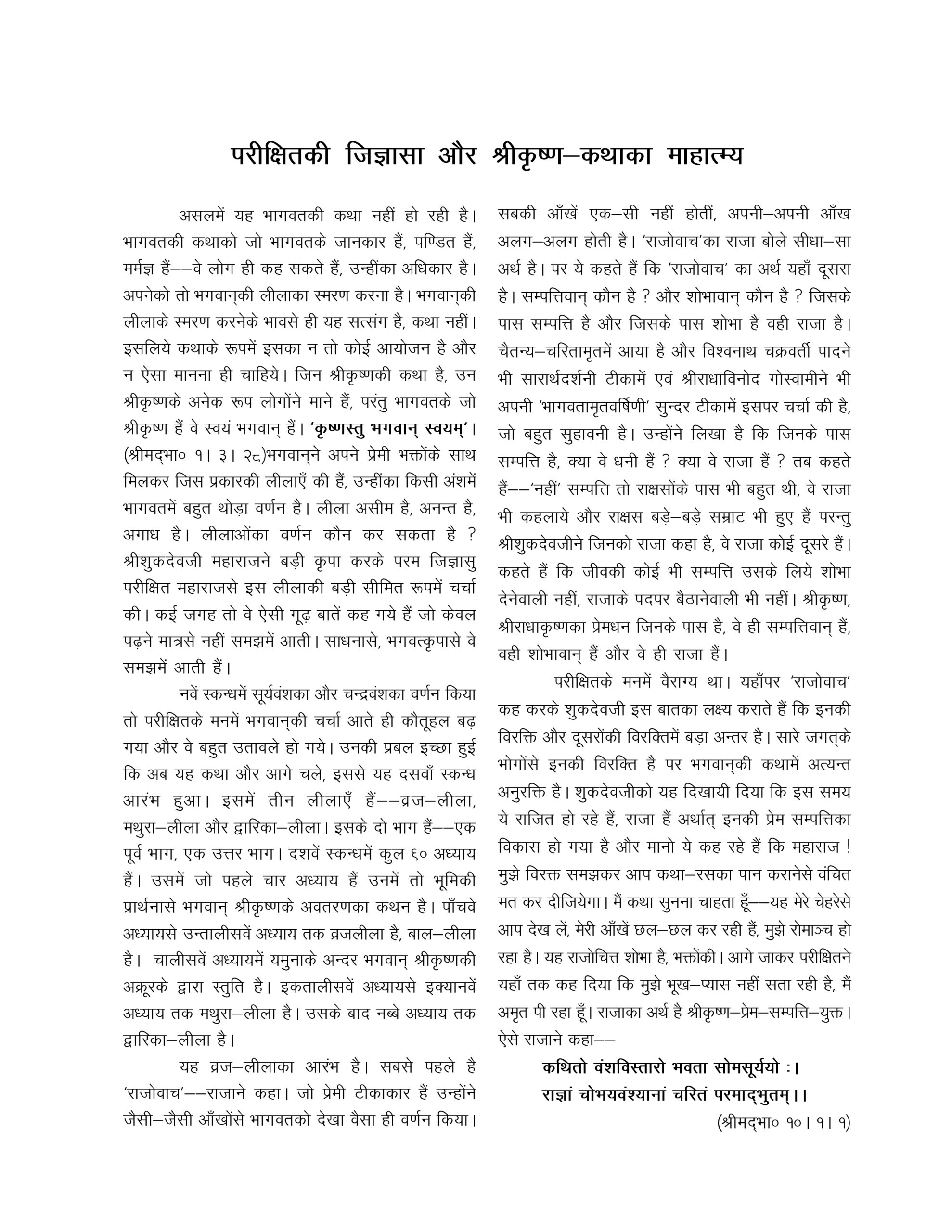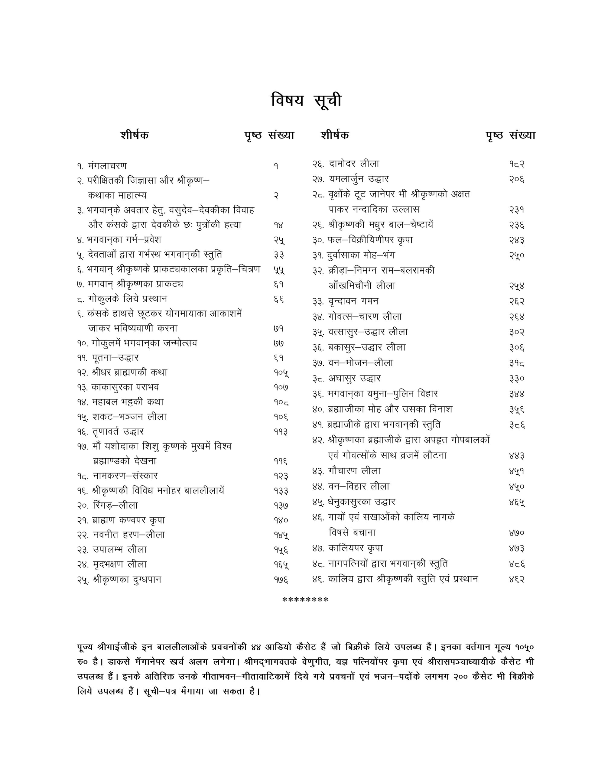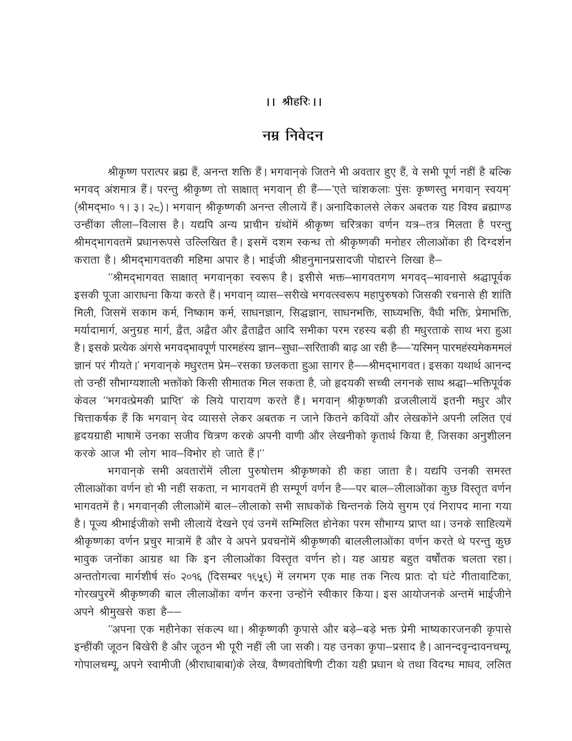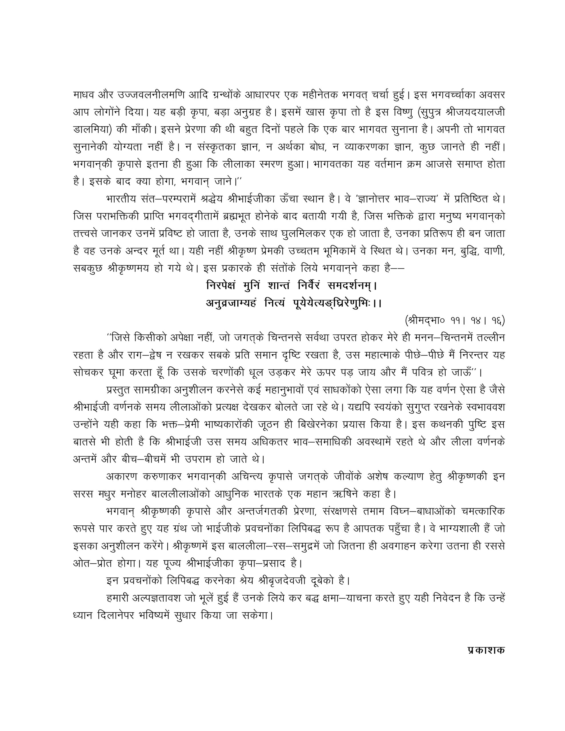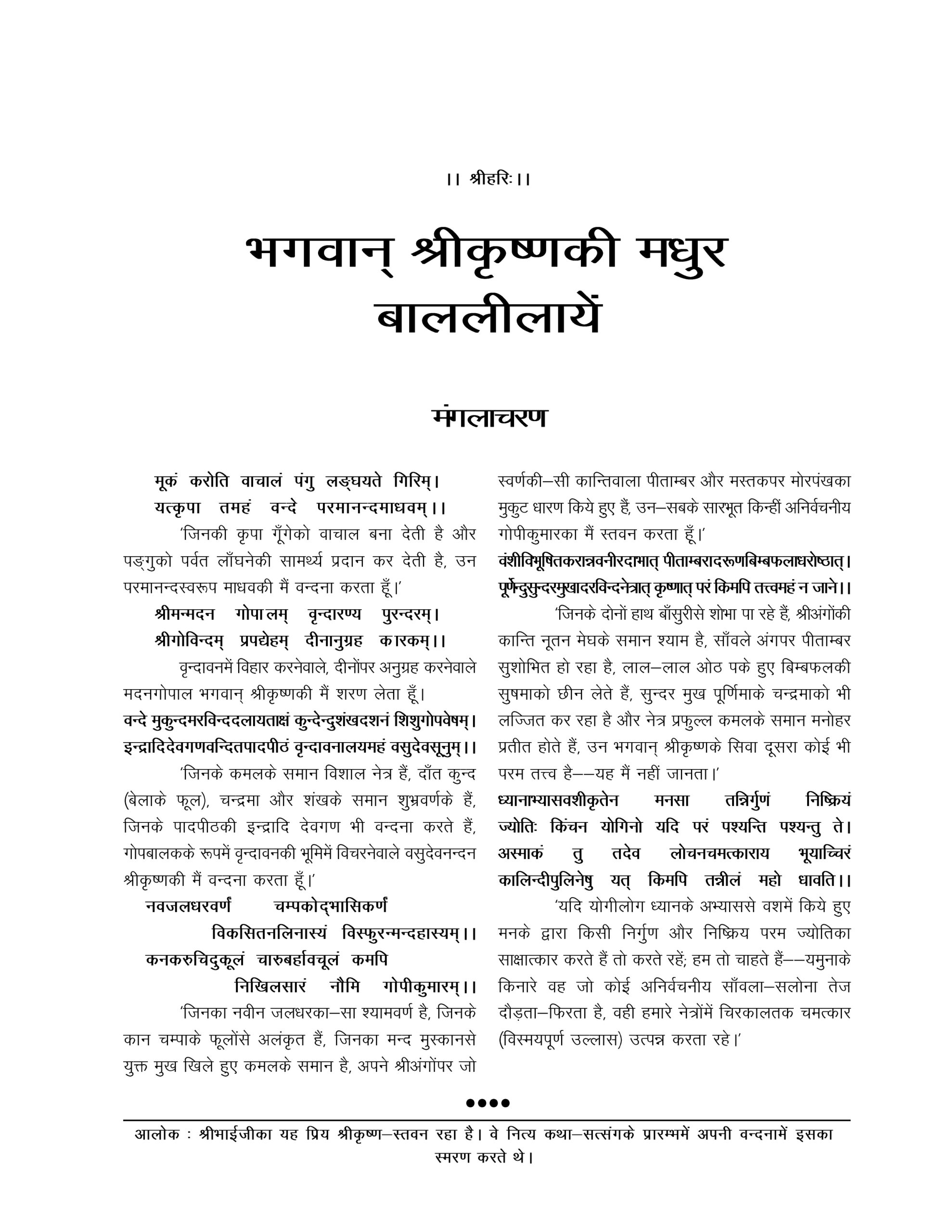 श्रीमद्भागवतके दशम स्कन्धमें वर्णित भगवान् श्रीकृष्णकी बाल लीलाओंका सुन्दर सरल एवं हृदयस्पर्शी वर्णन है । ऐसा प्रतीत होता है कि आँखों देखा विवरण है। इसमें लीलाओंका जैसा शब्द-चित्र प्रस्तुत किया गया है वह विरल है। यह भगवत्-लीलाओं के दर्शी एक महान ऋषिका कृपा-प्रसाद है। एक पठनीय, संग्रहणीय एवं उपहार देने योग्य सचित्र, सजिल्द ५०० पृष्ठोंका “भगवान् श्रीकृष्णकी मधुर बाल लीलायें” सुन्दर ग्रन्थ है।